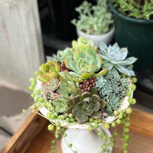 今日は29℃/21℃なんだけど… 家の中、29℃あるので夕飯時はエアコンつけました。 昼間はまだ暑いね… 夏の間にボロボロになった寄せ植え… とりあえず、土も入れ替えて寄せ植えし直しました。 生き残った多肉ちゃんはとりあえず別に移して様子見です。 柏谷商店さんのもりもりセットとこの前届いたハニーミントさんのセンペルビウムの子株たちを少し使って寄せ植え。 紅葉してないから緑緑してるけど、とりあえず自己満足。 また週末に他の鉢も寄せ植えし直したいわ〜