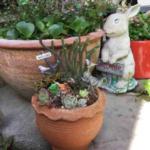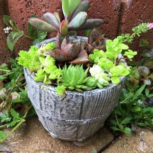 こんな時間に こんばんは。 先に投稿で🙏 寄植え途中の パウンド型レンガ風鉢 途中で放置したらこんななりました😅 でも…このまま放置します🤣 このパウンド型 初めて作ったレンガ風! これを改良して…プレ企画にしたから この鉢は1号 2号3号はお嫁に貰ってもらったよ😆 リバーシブルだから 次は裏側で投稿しようかな〜🤭