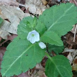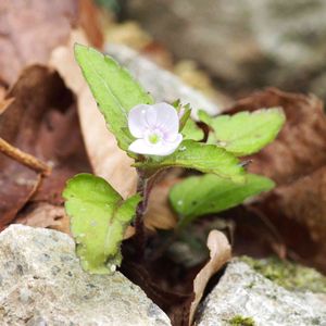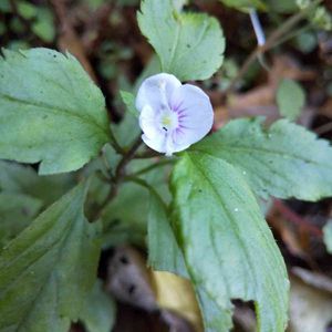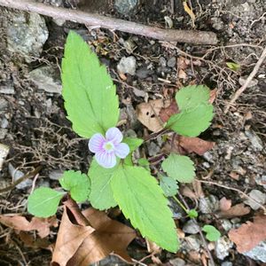 里山の林道で見つけました。 花は オオイヌノフグリ に見えますが、葉が ? あってますか? または 別の花 ? 「クワガタソウ」と 教えて頂きました🎵