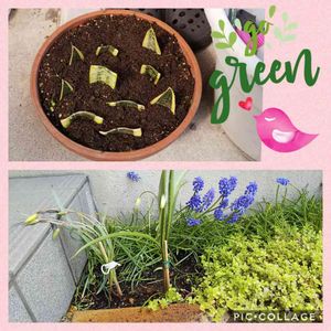 ㊤冬越し失敗したサンセベリア😱 カットして、挿してみた😆気長に見守ります🤣🤣 ㊦放ったらかしなのに、ムスカリと原種チューリップが沢山出てきた❗️風がきつく、原種チューリップが倒れたので、割箸で支えてみた😆☀️