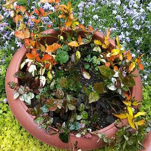 黄金カズラの新葉が紅葉のように燃えてます🍁🍁 鉢は、芝桜とマルバマンネンクサに埋もれてます😁