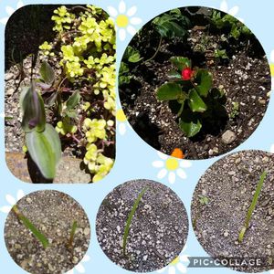 今日のお庭です☺️ トラカンは、どこに挿しても元気にのびます🌱🌱 ベゴニアの枝が折れたので挿してたら、元気に育ってます🌱 タマスダレの芽が沢山出てきました🌱🌱