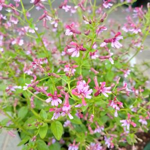 おはようございます😅💕 玄関先の鉢植えの中 クフェアピンクシマー🩷&カラミンサが絡み合っているよー😅💞
