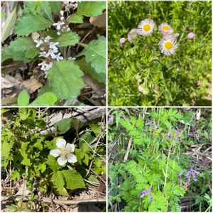 今日のお出かけ先で 出会った山野草たち 左上 シロバナ ニシキゴロモ 左下 クサイチゴ 右上 ハルジオン 右下 ムラサキケマン