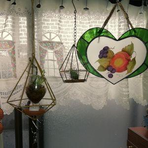 見せて楽しむ植え付けにしています。キャンドゥから購入のガラス容器にピッタリの発泡スチロールで出来た苔玉風ドーナツ型の真ん中に水苔で植物を入れて、苔は庭で石に張り付いていた物を剥がして苔玉風に作ってみました。材料費は200円です。