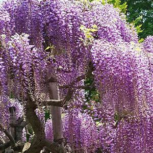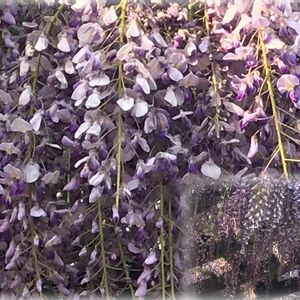【藤】 フジの花は薄い紫色で、「藤色」の色名もこれに由来する。 たおやかに垂れるフジの花姿は振袖姿の女性みたいでうっとりします。日本では古くからフジを女性に、マツを男性に例え、これらを近くに植える習慣があったそうです😁✨