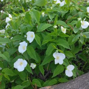 今朝の庭から… 8:01〜8:30 今朝は水やり免除😊 ④ 🍓の花は *あまいろは ⑤ 満開のシロヤマブキ♡