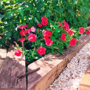 庭に入って左奥あたりにある木製花壇♪ こちらも鉄のかすがいで角を繋いでます。 後ろ、ハバネロ系のトウガラシなのですが近いうちに赤か黄色に色づくようです。 手前はペチュニア。 しかしペチュニアだらけだ笑