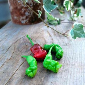 ハバネロみたいなやつ カリビアンボンバーって名前でどの交配種か謎 熟れたら赤くなるのですが、その前に触ったらぽろってよく取れるので前にも一度調理済み これ入れるだけで激辛になりますw