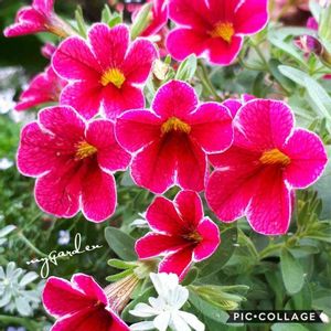 カリブラコア•チェリーレース とても明るいお花です🌼🌿 白の縁取りが入っているから赤が際立って見えます😊 大変な雨台風🌀でしたが無事過ぎ去りました…今日も☔雨です カリブラコア元気になる 明るいお花です💕୧(*´∀`)୨💕