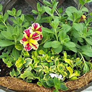 少し前にハンギングに植えたカリブラコア 今年初めて見る色だったので斑入りのバコパと🌼