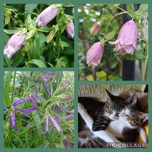 ホタルブクロ🎵 ↖️うちにずっといる極普通の😂 ↙️去年、中之条ガーデンズの帰りに寄ったお花屋さんで見つけた子🎵 ↗️今年、花友さんにいただいた八重咲き🎵 みんな名前はわかりません😅 ↘️相変わらず願も🐱とつみれ🐱はべったり~兄妹ってこんなに仲いいの? 相思相愛みたいよ~(*´艸`)💕