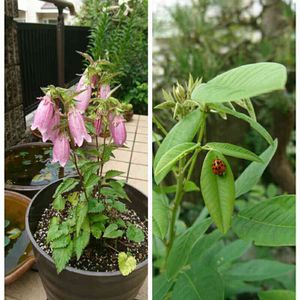ホタルブクロの花が咲いています。 ハギの葉にはテントウムシ?が…。 この写真ではわかりにくいのですがハギの葉にはアブラムシがいたので食べに来たのかもしれませんね。
