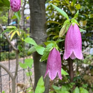 ホタルブクロ クレマチス プランターに植えた ホタルブクロが次々と 開いて来ました‼️🎶 柿の木の後から クレマチスも覗いています‼️😃