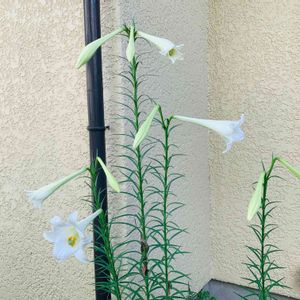 日陰の庭の隅で咲きました✨ 日陰のせいか、背丈が伸びてます。 椿の根元から生えた百合は椿の木の上まで伸びて花を咲かせました❗️ 清楚な姿の中身はど根性精神いっぱいなんですね🥰💝✨ 2021.8.5