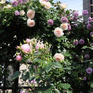 連投すみません💦 今年の我が家のアーチの全体感はこんな感じでした💜 アーチのレイニーブルーとブランピエールドゥロンサール、手前のハンスゲーネバイン、ほぼ同時に咲いてくれました💗