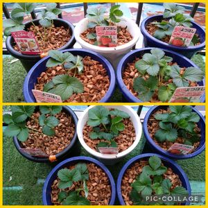 こんばんわ! ちょっとにわか雨にやられましたが、いちご苗よつぼし4株、白蜜香1株定植終わりました。 65センチプランターで2株植えにするか迷いましたが、1苗を大事に栽培したいので場所は取りますが、この形にしました。 一番の課題は水やりです。 マルチングしていますが、乾燥に注意します。 残り12株は来月購入予定4株と一緒に定植します。 次に久々に小玉スイカですが、約2ヶ月半栽培してきましたが、テニスボールの大きさから大きくなりません。 本当に小さいスイカですね😅