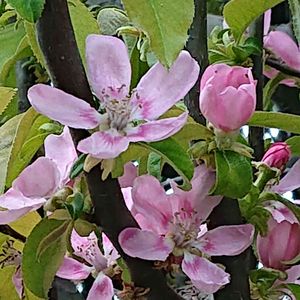 昨日までは 高い所だけの開花で 下側は 蕾姿ばかり 今日は 殆ど可愛い笑顔 大木はグリーンの葉に ピンクのリボンが 飾られている様でした🌿🎀 秋の 石の様に硬い実は 想像出来ない 可愛いピンクの花 🌿花梨🌿