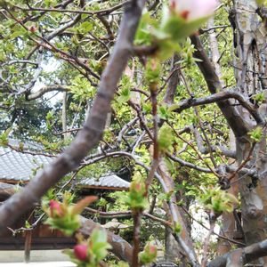 カリンの蕾が膨らみ、開きかけている花もありました。 弓弦羽神社で。