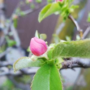 真丸な花梨の蕾、後ろには小さな実が。 去年は枝を払う時期が悪かったのか 実がならなかった 今年はできるかな?