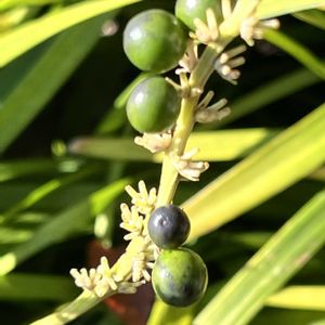 🍀🌻🪴💐🌹🌻🍀 🍀🖤ヤブランの実🖤🍀 💐ヤブランの花言葉は(忍耐)(謙虚)、 (謙遜)、(隠された心)などです 💐ヤブランは、東アジア原産の多年草 で、紫色をした穂状の小さな花が咲 く植物で、林の中などに自生してい る常緑多年草です 💐ヤブランの開花時期は7月から10月 で、紫や白の花が咲き、花のあと秋 から冬に かけて花の後に最初はグリ ーンで後に黒紫色の実が付きます 💐ヤブランは、日本の林の中などに自 生している常緑多年草です 💐名前にランとつきますが、ランでは なくヤブのような場所に生え、ラン の葉に似ているのが名前の由来で(リ リオペ)という学名で呼ばれています 🍀🌻🪴💐🌹🌻🍀