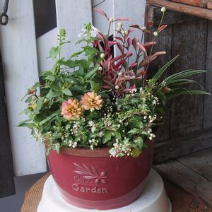 ラズベリーピンクのテラコッタに!ジニア.ベリーダブルの 寄せ植え #Garden#gardening #flower #ガーデン#ガーデニング #寄せ植え#花の寄せ植え #コンテナガーデン #花と緑のある暮らし #癒やし#メルカリ #鉢花#フラワー#ナチュラル#秋#花#humminggarden