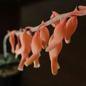 ガステリアの臥牛(がぎゅう)が開花しました 花径の長さは70cmにも及びます 花の形が胃(gaster)の形に似ているのが ガステリアの語源になっていますが 羽をむしったチキンを吊るしてるみたいです