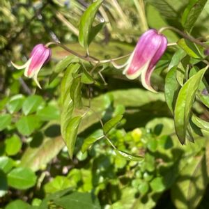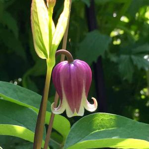 壺型クレマチスの桃の君が咲き進み、お口がクルリンと反り返りましたー(o^^o)♪