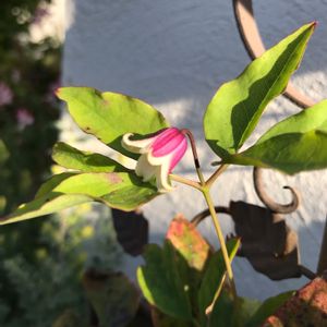 クレマチス・桃の君🌸 とっても小さく咲いています🎵 わが家の今年度のクレマチスは、この子で終わりになりそうです😭 また来年です😘
