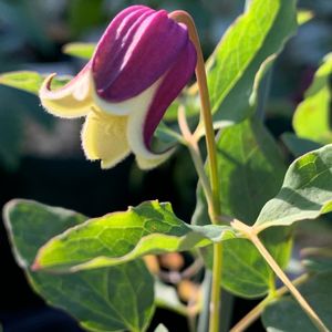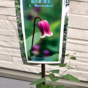 桃の君 ちっちゃな壺型の半木立性クレマチス 今年も咲きました🍑 半木立とはいえやっぱり支えてあげないと 花が地面すれすれになってしまいます😅