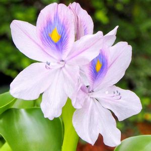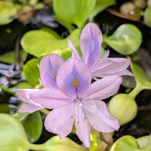 8月10日 今日のお花 🌿💜💛🤍ホテイアオイ🤍💛💜🌿 熱帯アメリカ原産で、明治中期に家畜の肥料や鑑賞用に導入された多年草です。 別名 ホテイソウ ウォーターヒヤシンス 水に浮く水性の園芸植物。丸い葉柄を七福神の布袋様の腹に見立てて名がついた。花は6枚の烈弁に分かれて、その中の1枚は紫色の斑に囲まれた黄色の斑点がある。 園芸店や金魚屋さんで売られてますが、世界各地で野生化している丈夫な水草です。 花期 8〜10月 花色 薄青紫色 🏷️愛しの紫
