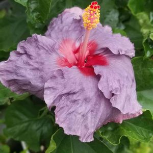 ハイビスカスデニムブルー💜 ベランダから避難させようと思っていたのに忘れてしまった😖 でも台風の影響はなかったのでよかったぁー😊 今朝咲いたデニムブルー、以前より色が濃くなった気がするけど、これは雨上がりのせい⁉️