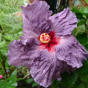 ハイビスカス デニムブルーの花が咲いてます🤗 デニムブルーと言うより紫だよね🎵 ☂️雨でなく🌞が似合うお花なのにあいにくの☂️だわ💦