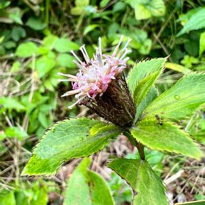 ③秋に径約2cmのアザミに似た 筒状花 雌雄異株(2025・9/25) 総苞の周りにある魚の骨の ような苞葉が特徴です。 ①②果実は痩果で 暗褐色 果実には伏毛が上向きに密生する そう果よりも長い長さの そろった冠毛が多数つき 淡褐色で羽毛状 果実時期も独特な苞葉がある (自宅の鉢植え🪴) 朮(おけら) キク科