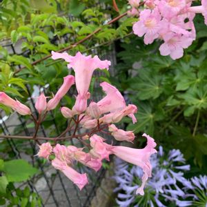 ピンク色のノウゼンカズラのお花が咲いています✨🌸🌿 淡いピンク色に赤紫色のスジが入って長さ8センチくらいの鐘型、漏斗形です✨ オレンジ色のお花とまた違った雰囲気で可憐です✨ ピンクノウゼンカズラは、南アフリカ原産 オレンジ色のノウゼンカズラは中国原産です✨ 一つ前のジャカランダのお花はノウゼンカズラ科 ピンクノウゼンカズラ ノウゼンカズラ科 ポドラネア属 🏷ピンクワールドへようこそ 参加します宜しくお願いいたします✨