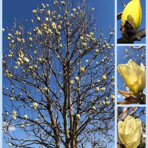 庭の黄木蓮が咲き出しました💛💛💛 晴れの予報だから、開花を楽しみにしてたのに、風が強いのなんの、突風ですよ〜💨💨 今日は鳥の鳴き声🦅じゃ無くて、畑のビニールマルチが外れてバタバタバタバタとすごい音を立てています😆😆