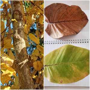 今日の庭 大きな葉っぱが茶色くなって、毎日大量に降っているのに、上の方はまだ緑色🍀で、どれだけ葉っぱがあるの~?の木の名前を教えてください!