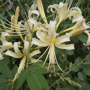 今日のお花「ハマユウ」は、ヒガンバナ科の多年草です。白い「ヒガンバナ」がよく似ていますね。😊 「ハマユウ」はハマオモト属、 「ヒガンバナ」はヒガンバナ属です。🤔😄 ①ヒガンバナ 昨年9月22日📷! ②ヒガンバナ 昨年9月24日📷! ③④リコリス 昨年10月5日📷! また、「ハマユウ」と同じ海浜植物に「ハマゴウ」シソ科ハマゴウ属のお花があります。🤗 ⑤ハマゴウ 2022年7月16日、鳥取砂丘の近くの海岸にてパチリ!📷🌞✌️