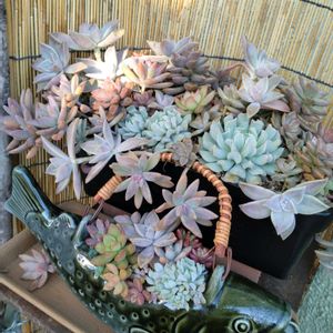 植え替えるときに どうしても 捨てられなくて 増えてしまう 葉挿しの ちび苗や だいぶ 成長した 脇芽挿しの 子たち 室内へ 入れるため まとめ 寄せ植え しました これで ずいぶん 場所の 節約に なりました でも … もう 2〜3鉢 必要かも …