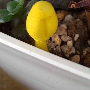 びっくりポンლ(^o^ლ) ゼラニウムを撮った時は気が付かなかったのに、今! 多肉さんの鉢に黄色い物が 黄色の多肉さんは持っていないなぁと思ったらキノコ 幸運の黄金絹唐傘茸🟡のようです 何か良い事あるかしら?🎶