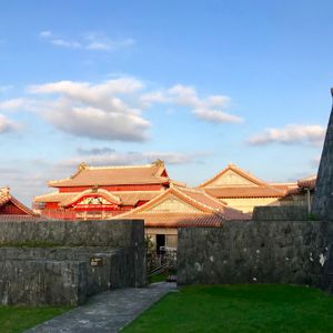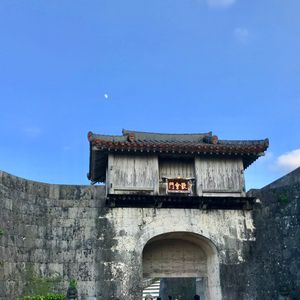 先週末沖縄④ 首里城公園は歓会門 石垣の左上↖️この曲線が気になる🎶 屋根の左上に下弦の月が🌓写ってます♡