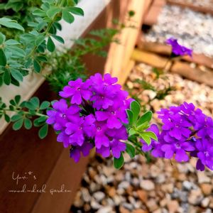バーベナ·テネラ 𖡼.𖤣𖡼.𖤣𖡼 咲く時はいつも お日様求めて鉢から飛び出しちゃう♪ 因みに一緒に飛び出して 絡み合っている🌿は ロータスブリムストーンです! 陽当たりの良い草原の様な場所が ベスポジの子です🔆🏜️