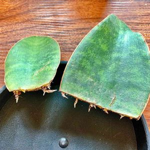 5/5にマドカズラさん降ってきて綺麗にもげたマッソニアーナさん葉挿しして1ヶ月 発根確認♡やった〜✨ 親株からは3つの子株 葉挿し2枚 マッソニアーナさん6人家族ヾ(´∇`)ノ