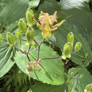 タマガワホトトギス(ユリ科) 花の色をヤマブキに見立てその名所である京都府の玉川からつけられたのが名の由来 冷涼な地域に分布し東日本で唯一見られる黄色のホトトギス 北限は白神山地 花被片と花柱に紫褐色の斑点がある (花糸や葯にはない) 花柱は上で3裂し放射状に広がり先端で2裂 その花柱にキラキラした水滴のような腺毛状突起?? (何かを分泌する為の突起???) 少し湿ったうっそうとした林内にありました 7/9