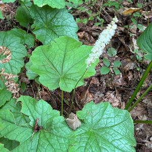 オオバショウマ(キンポウゲ科サラシナショウマ属) 本州、四国、九州に分布 湿り気のある林床に生える多年草 花茎の先に穂状(無茎)の花がつき 花は下から上へ咲きすすむ ①②③ 道の脇で毎年1、2株出てきています 春に出る葉は大きくてわかりやすいのですが 毎年花がつくとは限らないようです ④⑤ 月一行く低山ハイクの登山道で ここも葉は大きくて目立ちますが花がつくのは 数株です この時期 高原内は大きなサラシナショウマがあちこちで 見られます どちらのショウマも花が咲いている時間は短く 白い糸のような雄蕊?がハラハラと落ちてしまいます