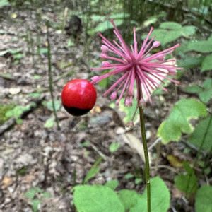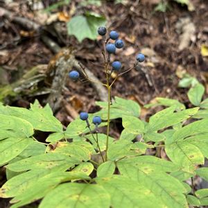 ルイヨウボタン(メギ科ルイヨウボタン属) 深山の明るい林内に生える多年草 葉がボタンの葉に似る事からの名 登山道の脇斜面にありました ⑤ 以前、春に花をみていたので実を見たいと思っていましたが やっとタイミングがあいました ④ これはご近所さんの 植栽されたものと思います キレイだったので🔵