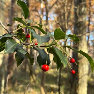 ソヨゴ(モチノキ科)常緑小高木 別名 フクラシバ 名の由来は風にそよいで葉が特徴的な音をたてることから 葉が茂っている時はどこにいるのかわからなくなってしまいますが 他の木が落葉した後は 冬青(ソヨゴ)の名のとおり 緑の葉が残っていて直ぐにわかります 森の中では倒木があちこちにあり特に白樺は弱い為折れたり倒れたりしています このソヨゴも倒れた白樺に押されて重そうにしていました 🪚ノコギリで2箇所くらい切って救出してあげました〜 お花は見てなかったけど沢山の可愛い 実がなっていました🔴 11/18