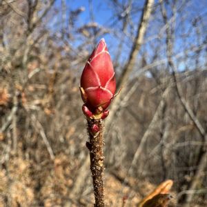 これも10月です マルバノキ(マンサク科マルバノキ属) 別名 ベニマンサク 10/27 ①② 小さな花が背中合わせに咲きます ③ 丸い葉がまだ少し残っていました ④ これはツボミなのでしょうか? ⑤ こけしのような葉痕がみえたので引き延ばして 去年はハート型の実も一緒に見られましたが 今年は上の方に少し少しあるだけでした 見過ごしてしまいそうなほど小さな小さな花です