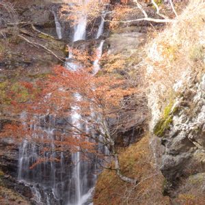 晩秋の開田高原で 📸 11月28日 ①唐沢の滝中間部と紅葉 唐沢の滝滝:100m ②ガマズミの実 ③ノイバラの実 ④コブシの蕾 背景の赤はブルーベリー ⑤マツヨイグサ?