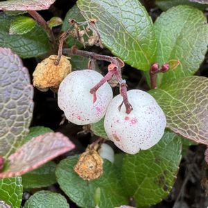 シラタマノキ(ツツジ科) 10/29 中部以北の高山、亜高山に生育する常緑小低木 同属な赤い果実のアカモノに対して白い果実をつけることから この白い実はサルチル酸という湿布の成分が含まれている 食べることは出来るそうですが口の中に湿布薬が広がるような感じだそうです(決して試しません😅) 一つ潰してみましたが微かにサロメチールのような香りがしました 御嶽山七合目2150m